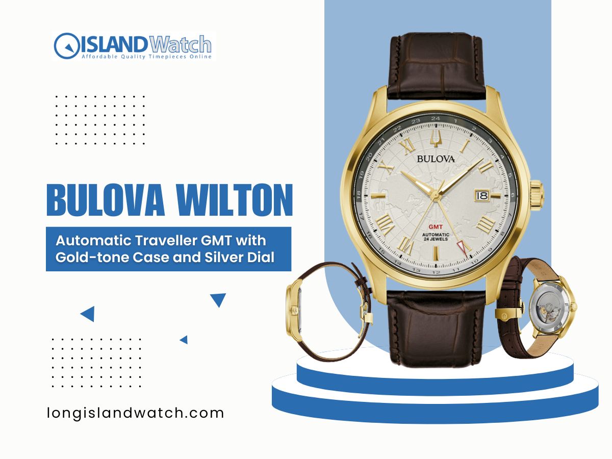 | Bulova Wilton 97B210 | Elegance and functionality for frequent travelers | Gold-tone case; Miyota 9075 GMT movement; globe motif dial | Set the GMT hand to track home time while traveling. |
