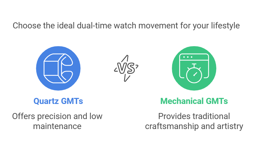 The movement is the heart of any watch, and dual-time models often come in either quartz or mechanical GMT movements.
