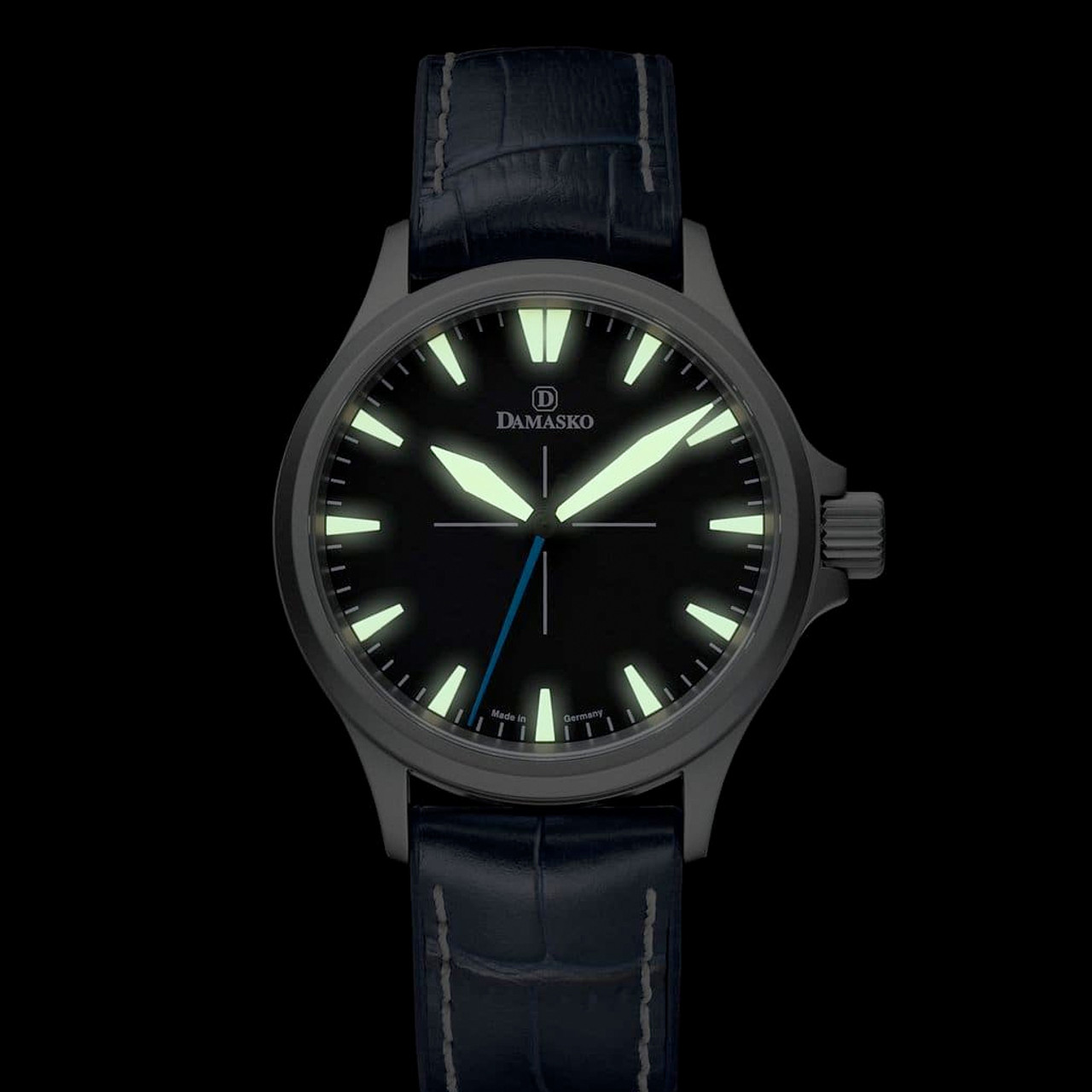 The DK30 has a distinctive design influenced by Damasko’s years of producing precision German made instrument and pilot watches. The matte black dial features impeccable application of white SuperLuminova for the minute-hour markers and the sporty sword-like hands. An anti-reflective (on both sides) sapphire crystal gives you an exceptionally clear view of dial and time. Note: no date window.
