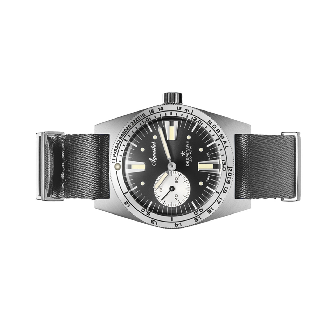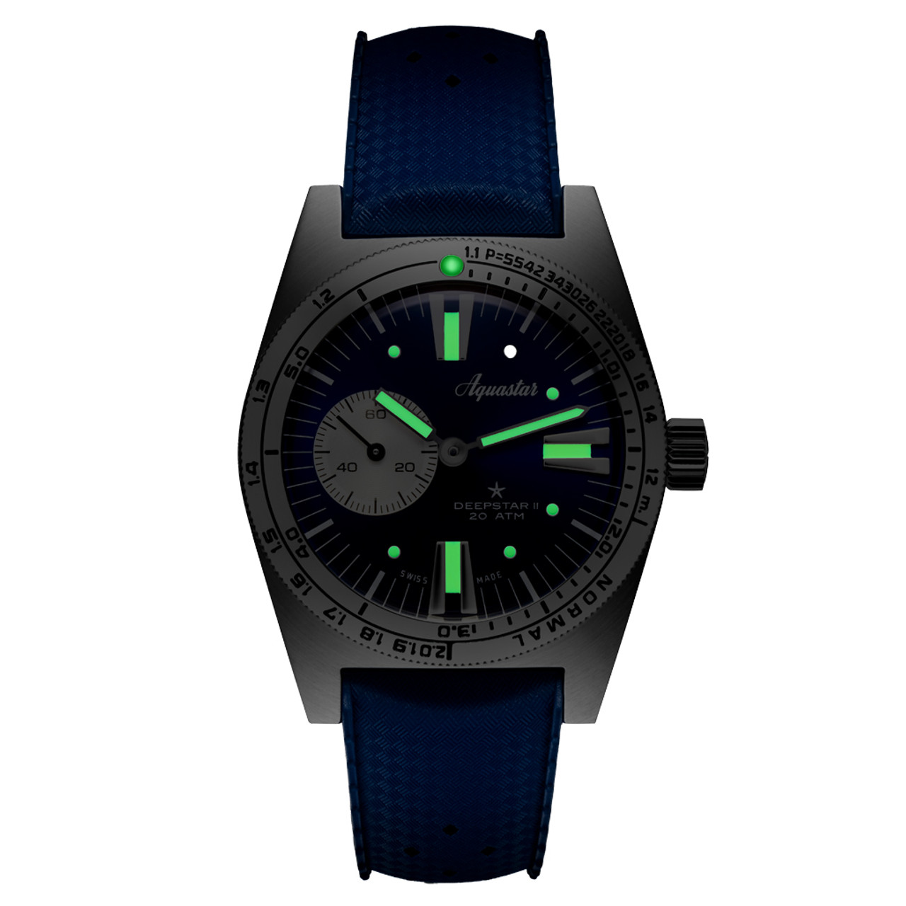 The Aquastar Deepstar II is the evolution of the original Deepstar from 1963, relying on the same patent of the original piece that enables calculating multiple dive and decompression times while housing a non-chronograph, easy to use 3 hand mechanism, and moderately sized 37mmX46mm for great comfort of wear. Being a result of recreation of one of the most influential dive watches of the 60s, the unique and uncluttered mono sub dial, and the patented multiple dive decompression bezel table make the Deepstar an unmatched diver-oriented tool with an instantly recognizable design.