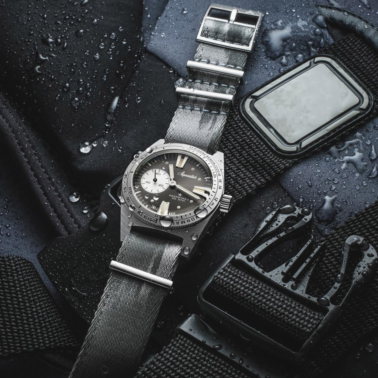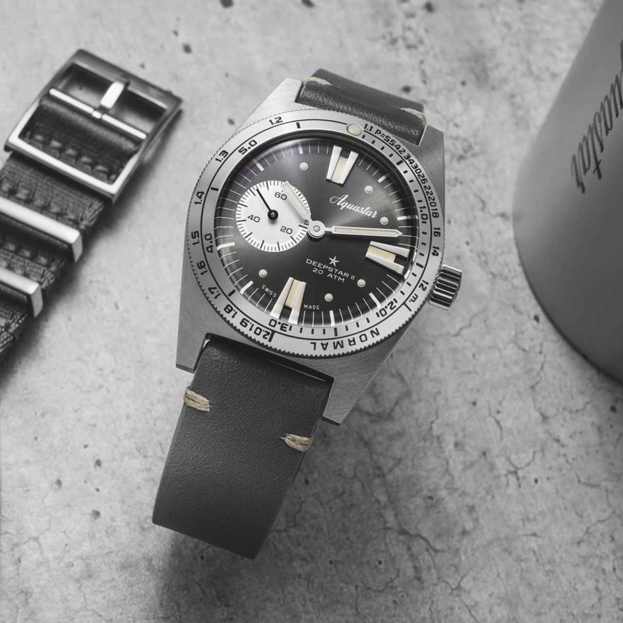 Housed in an eminently wearable 37mm stainless steel case, the new Deepstar II retains the function-first ethos and proportions of the pioneering Deepstar Chronograph from 1962, as well as two of Aquastar’s key identifiers: the rotating timing bezel bearing the brand’s own “no decompression” table used to time repeated dives (the first and only of its kind). It also features the emblematic “cyclops” style mono-compax counter originally devised by Aquastar founder and innovator Frederic Robert. Unique to the Deepstar II, this detail now houses the running seconds register at 9:00. Like the Deepstar Chronograph, the Deepstar II bears 200 meters of water resistance, and is powered by a top-grade Swiss-made automatic movement.