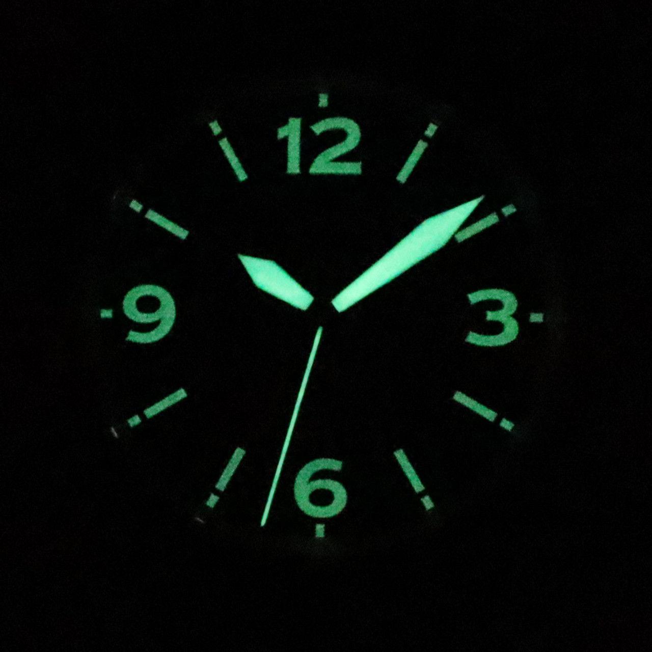 This Aristo 5H67TIBI watch features a classic aviator dial design with vintage color luminous hour and minute markers (glows green in the dark). A Swiss SW200 self-winding movement powers the watch (viewable via an exhibition window back). The 40mm titanium case has a blasted finish and it is only 10mm thick. The crystal is scratch resistant sapphire. A titanium bracelet completes the look. Great vintage looking pilot watch.