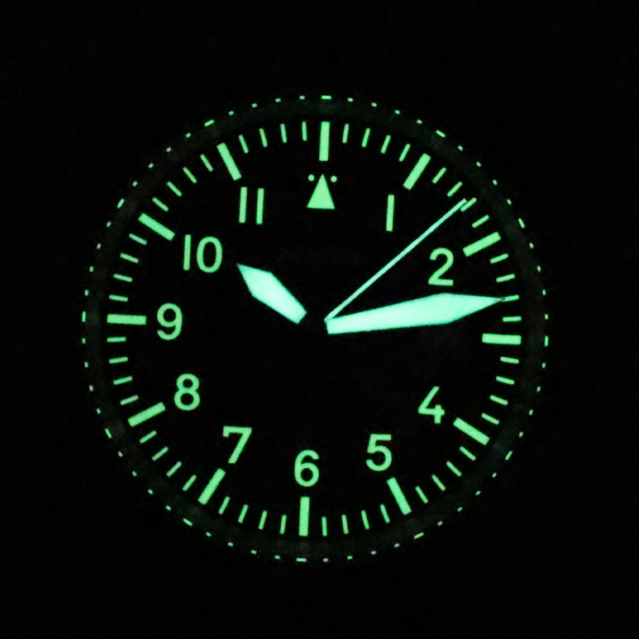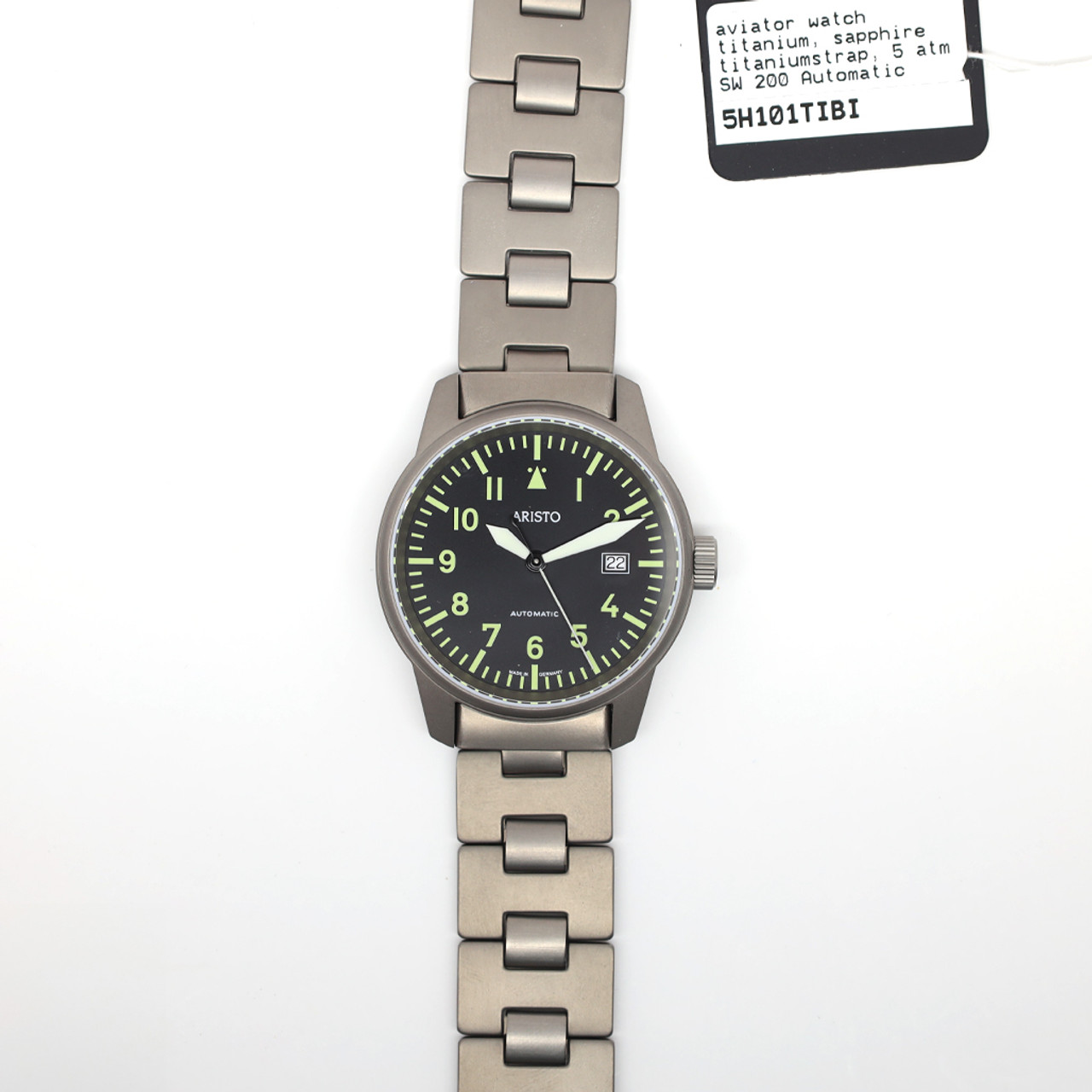 This Aristo 5H101TIBI watch features a classic aviator dial design with vintage color luminous hour and minute markers (glows green in the dark). A Swiss SW200 self-winding movement powers the watch (viewable via an exhibition window back). The 40mm titanium case has a blasted finish and it is only 10mm thick. The crystal is scratch resistant sapphire. A titanium bracelet completes the look. Great vintage looking pilot watch.