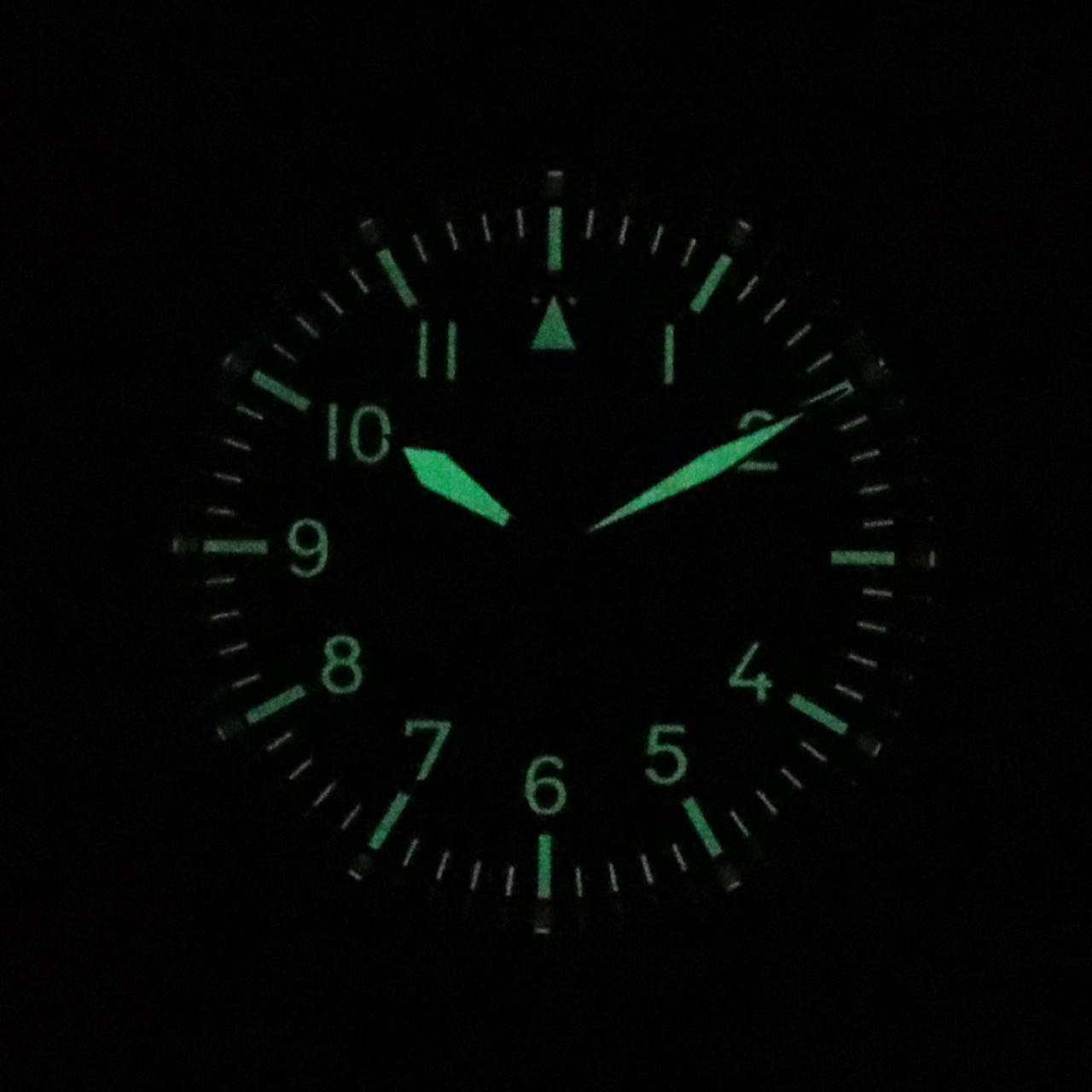 This Aristo 3H15N watch features a classic aviator dial design with vintage color luminous hour and minute markers (glows green in the dark). A Swiss SW200 self-winding movement powers the watch (viewable via an exhibition window back). The 38.5mm stainless steel case has a blasted finish and it is only 11mm thick. The crystal is scratch resistant sapphire. A textured leather strap with single rivets at the lugs gives the watch a great presentation on you wrist. Ensuring water resistance is a screw down crown. Great vintage looking pilot watch.