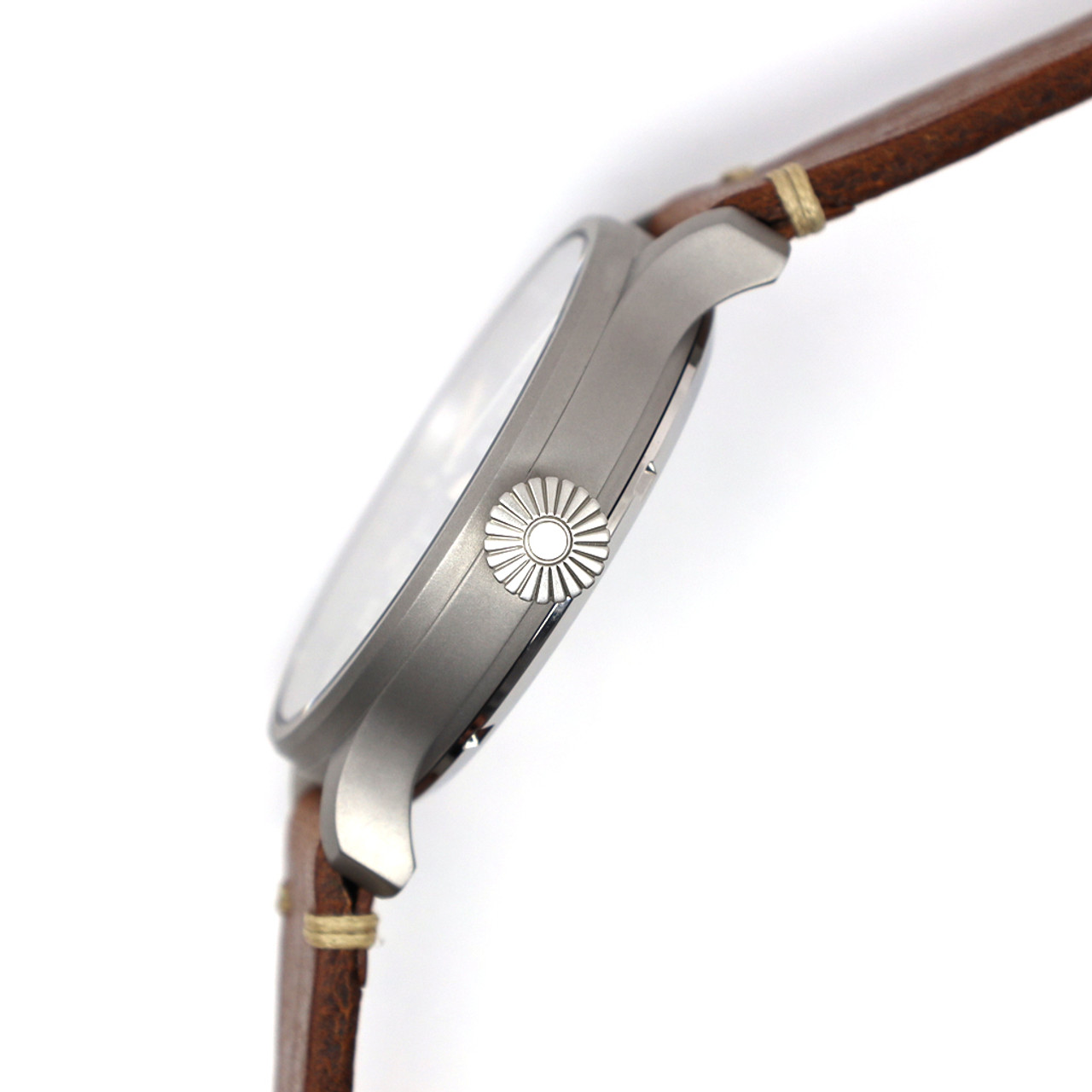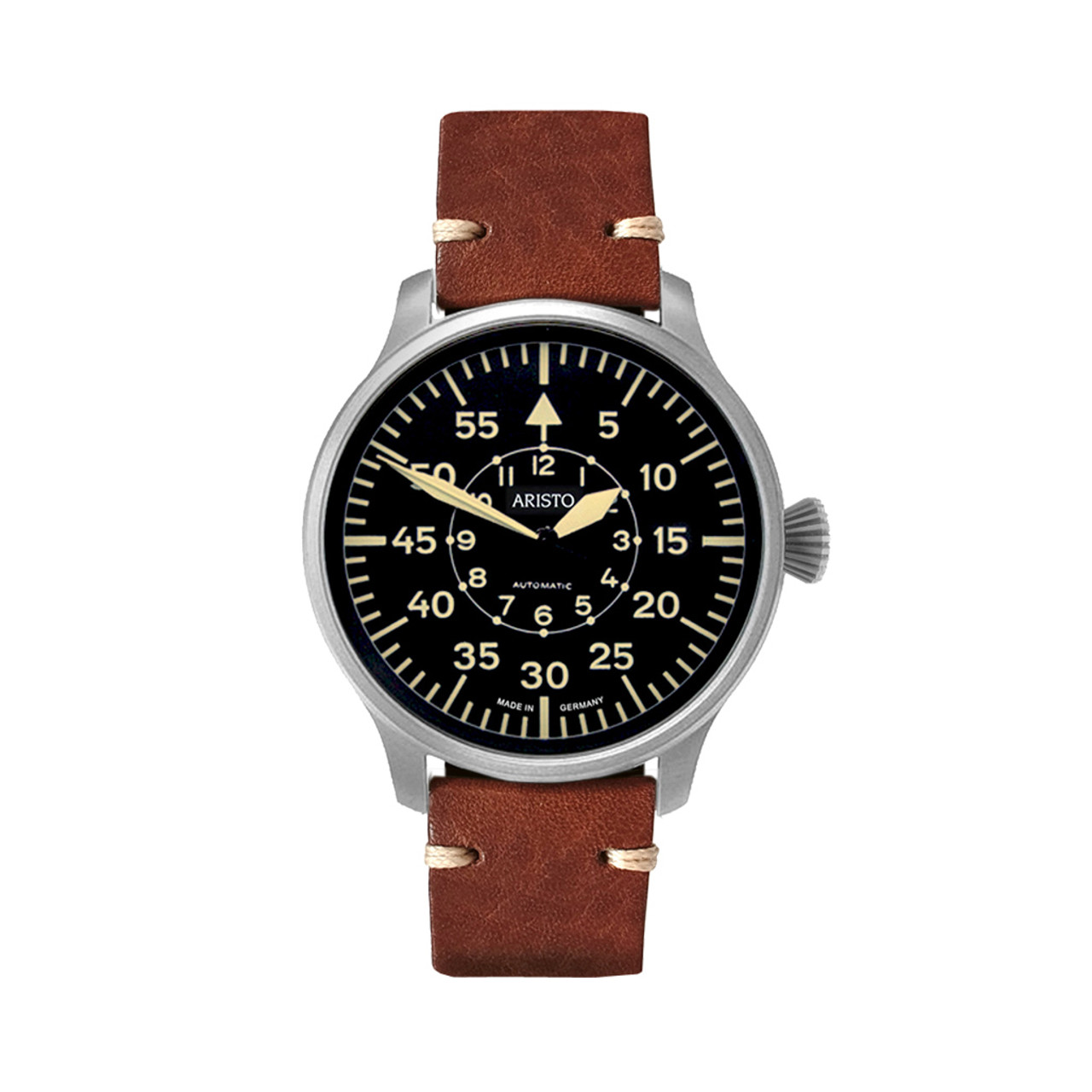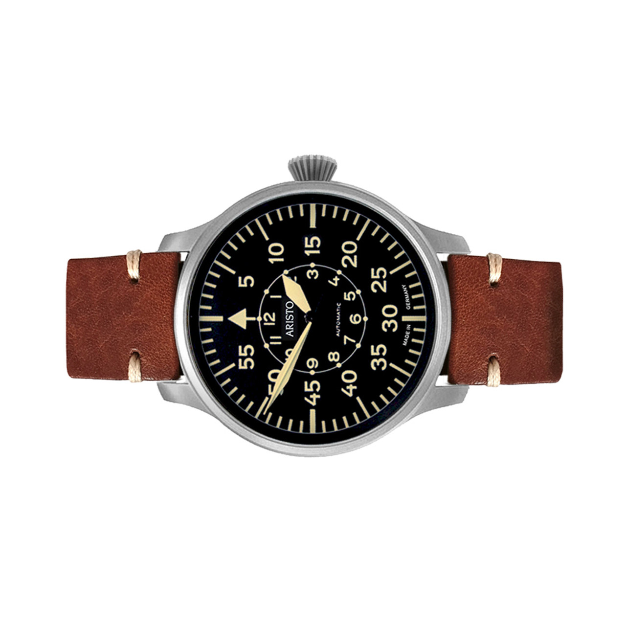 This Aristo watch features a classic black aviator dial design with easy to read hour and minute markers. The hands and markers are treated with Super-LumiNova for an impressive glow-in-the-dark feature. An oversize, diamond cut crown makes for quick time adjustments even if you are wearing gloves. Turn the watch over and an exhibition back shows off the Swiss SW200 automatic movement. The 42mm case has a sandblast finish, and with a case thickness of only 10.4 mm it easily slides under your shirt cuff. Comes with a brown leather strap with contrasting stitching.