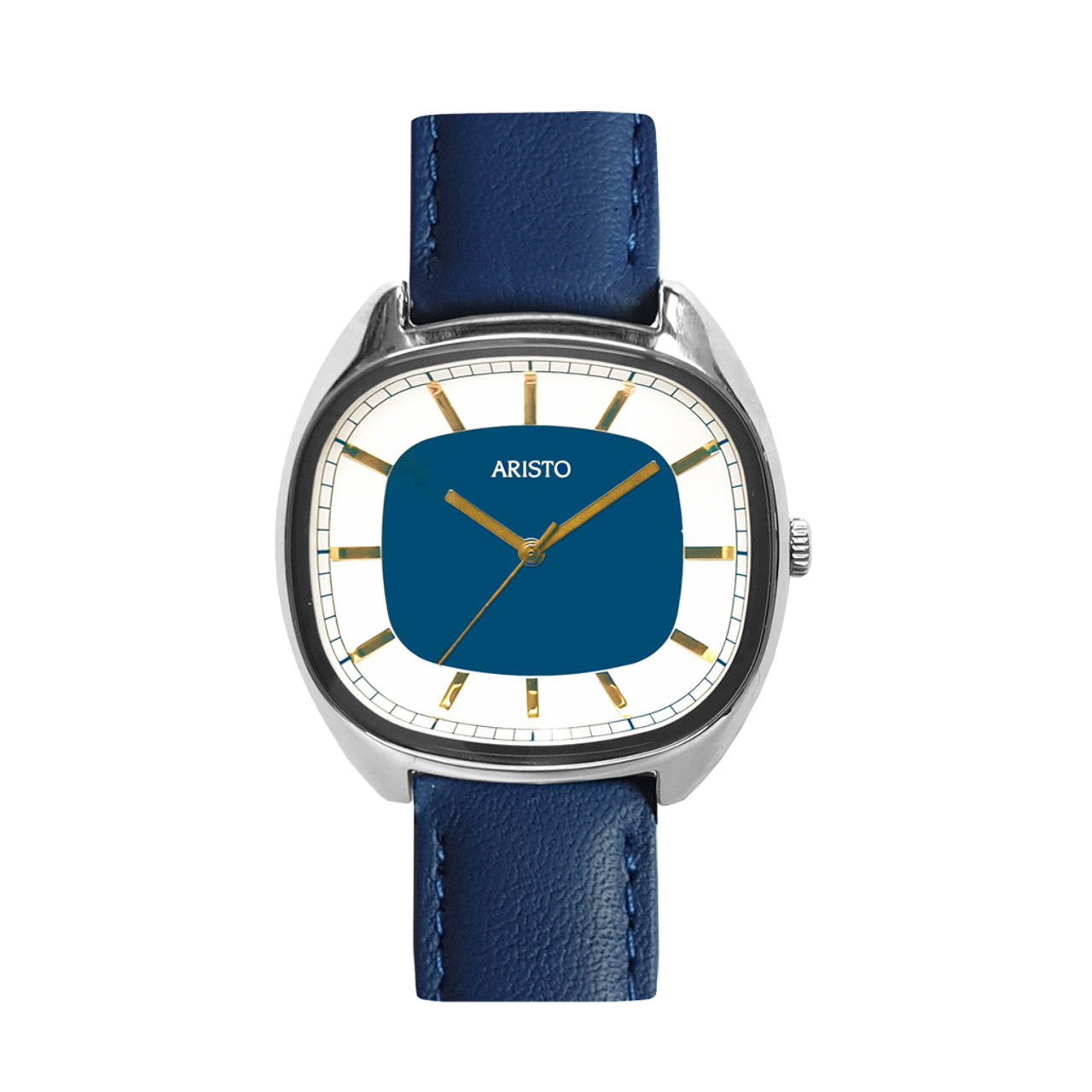 New from Aristo is this classic rectangular case dress watch. Very stylish and quite a departure from standard round watches, this model features a polished stainless steel case, blue leather strap and gold tone polished indices and hands. The dial is a matte blue.