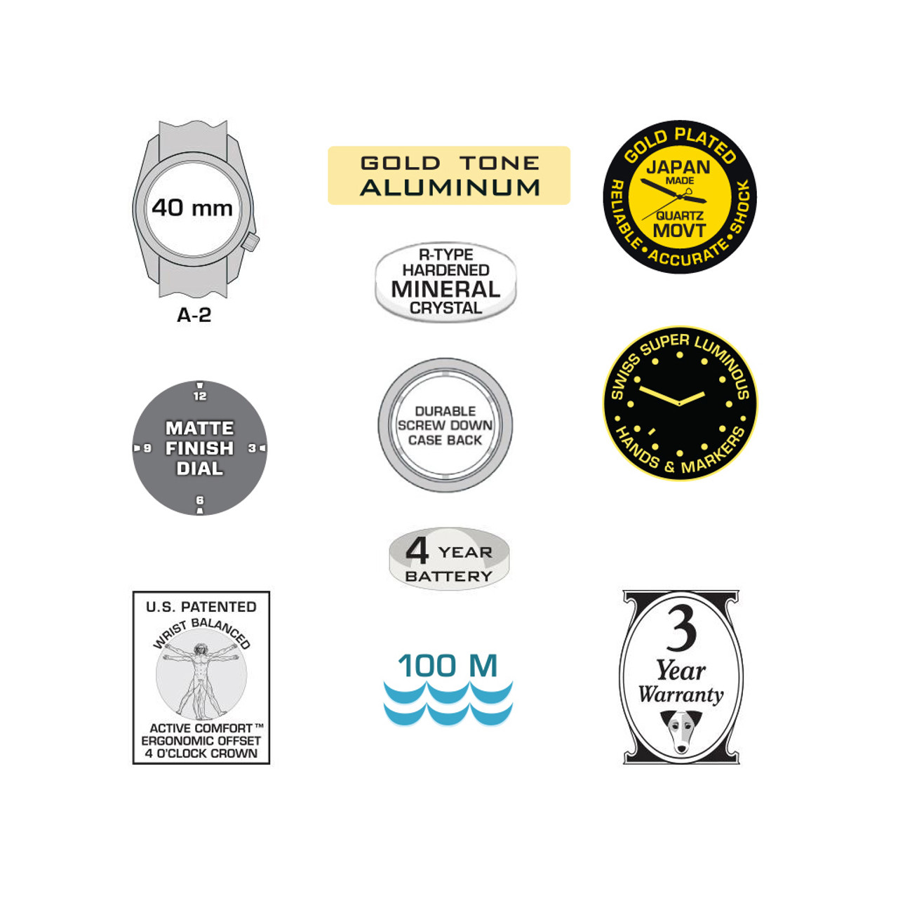 Rugged and refined dress field watch... The A-2A Golden Field™ innovative design brings together durability and comfort in a dress look. It features our legendary A-2 U.S. Patented Unibody™ 40mm case in non-reflective anodized gold tone aluminum.