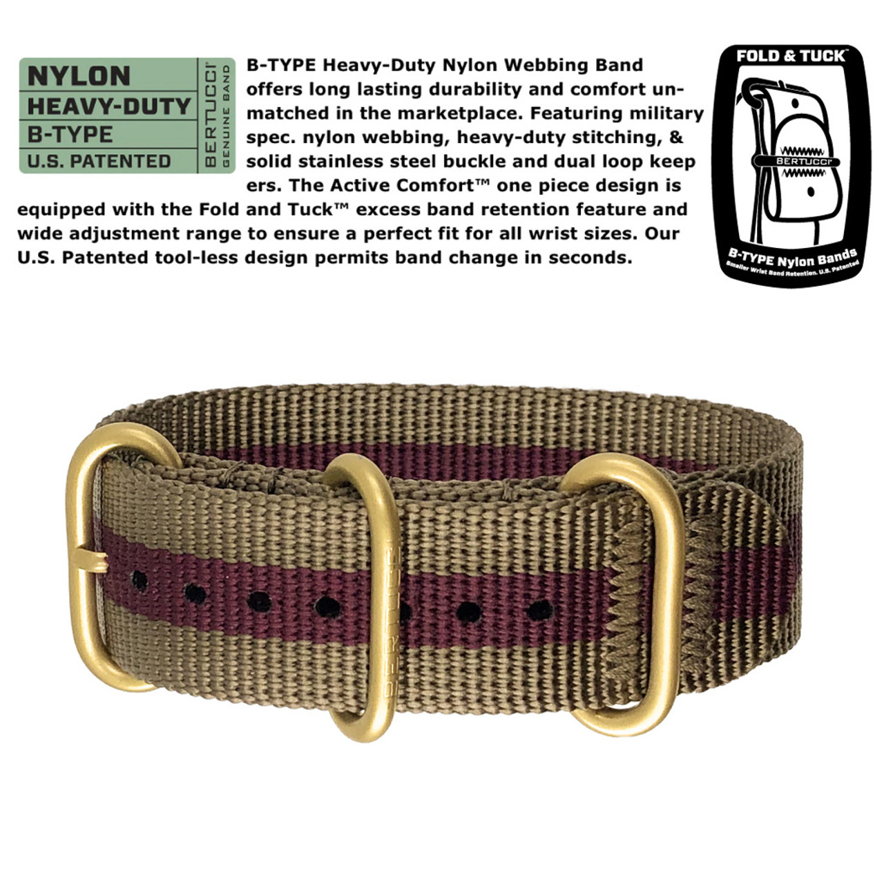 The versatile Golden Field™ requisite field ready features include: Easy to read functional dial with 12/24 hour markings, 100 meter water resistant, rugged B-Type Gold Line™ Nylon band, 4 year battery, accurate & long lasting gold plated all-metal movement, Swiss super luminous hands & markers, and scratch resistant R-Type mineral glass crystal.