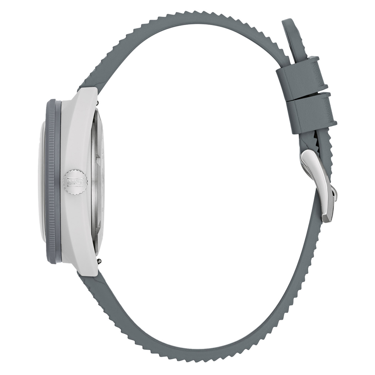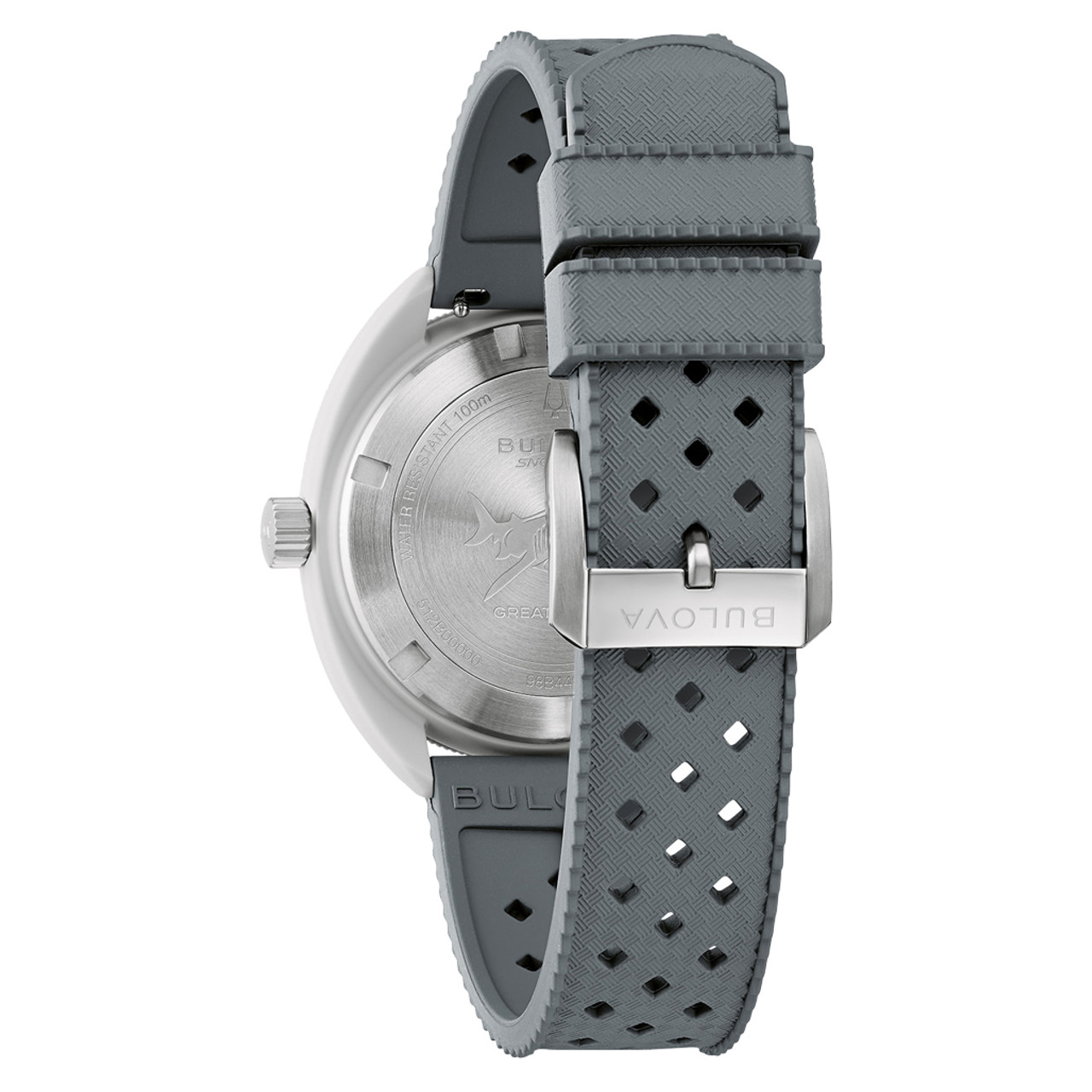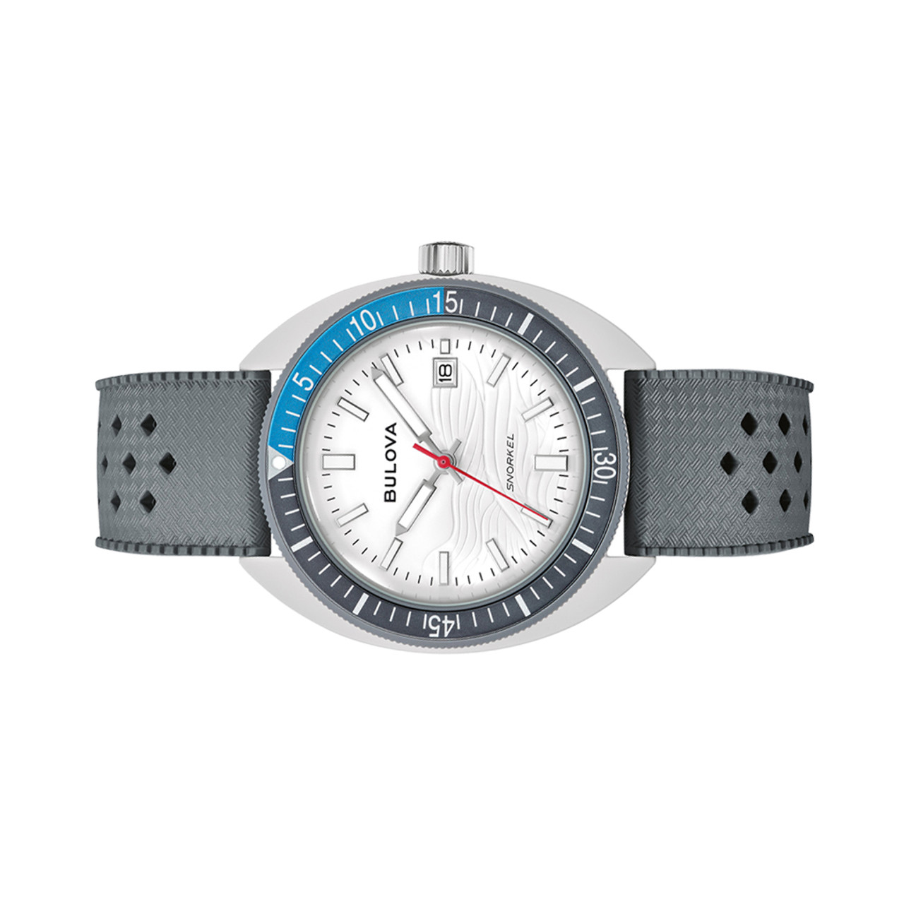 Continuing Bulova’s tradition of innovation and fine craftsmanship, our new Snorkel collection blends vintage-inspired design with a fresh, modern twist. The reimagined Bulova Snorkel shares DNA with the iconic Oceanographer through its classic yet recognizable case shape. In hues inspired by marine life, each 41mm timepiece features a retro case shape made with a new innovative Hybrid Ceramic—a composite material that feels luxuriously smooth with enhanced durability. This model’s wave-pattern white dial and striking hybrid case pair perfectly with a gray unidirectional bezel with a bi-color insert and a case back etched with an image of a Great White Shark, paying homage to its oceanic roots.