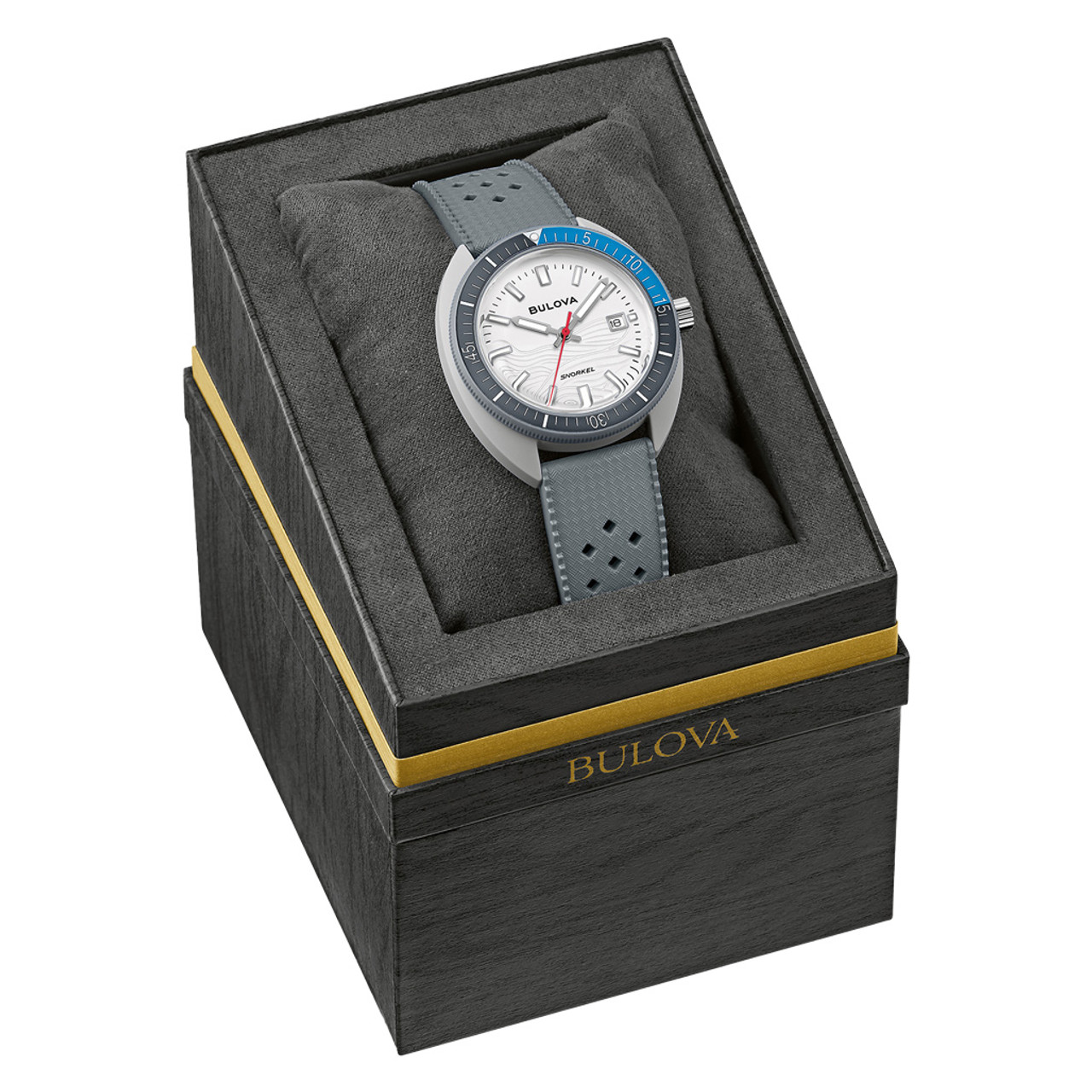 With silver-tone hands and markers with luminescent fill, a date display, and a matching gray perforated rubber strap, the men’s Snorkel embodies timeless design, and with 100m water resistance, it perfectly balances style and functionality with Bulova’s legacy of iconic watchmaking.