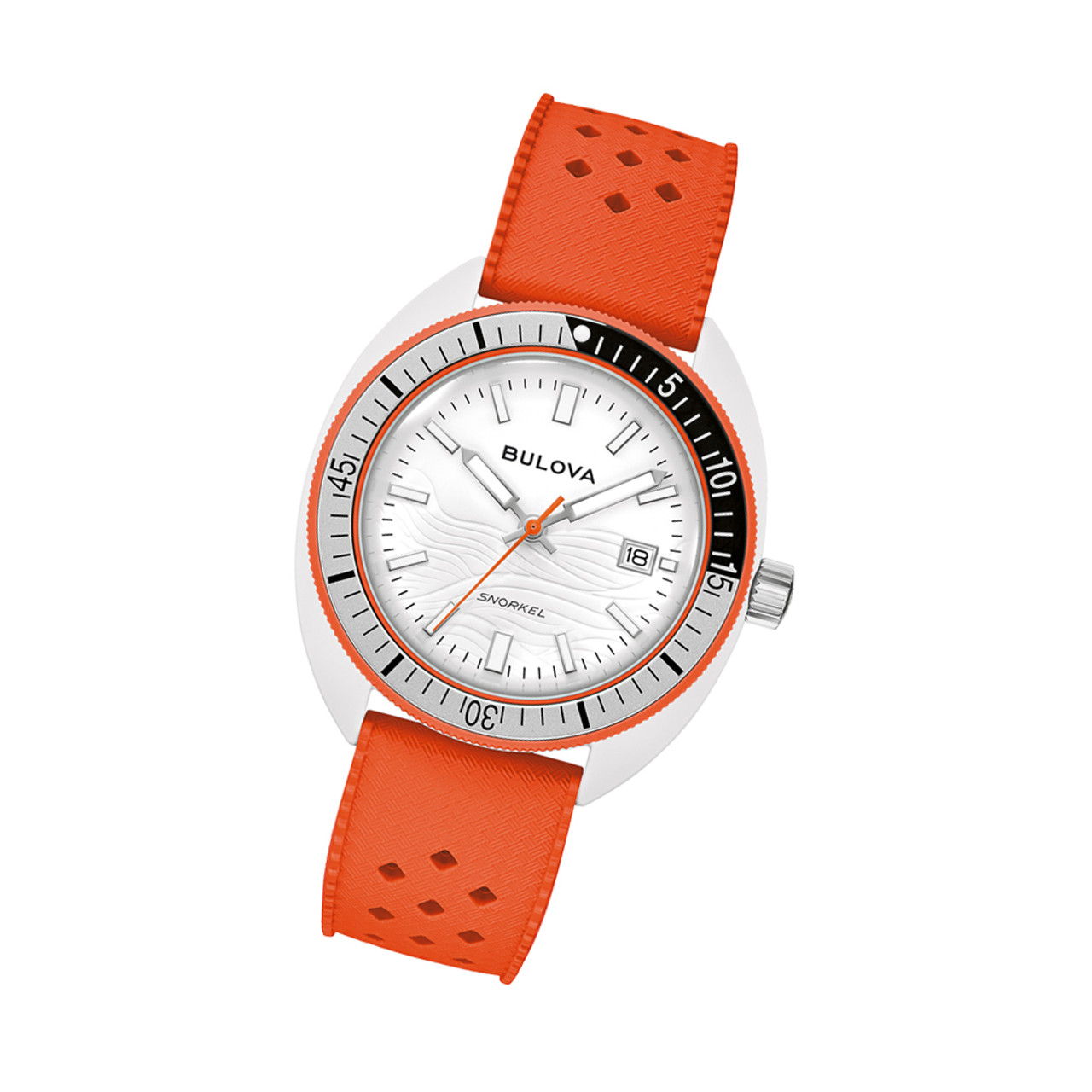 This model’s wave-pattern dial and striking hybrid case pair perfectly with an orange unidirectional bezel with a bi-color insert and a case back etched with an image of a Clownfish, paying homage to its oceanic roots. With silver-tone hands and markers with luminescent fill, a date display, and a matching orange perforated rubber strap, the men’s Snorkel embodies timeless design, and with 100m water resistance, it perfectly balances style and functionality with Bulova’s legacy of iconic watchmaking.
