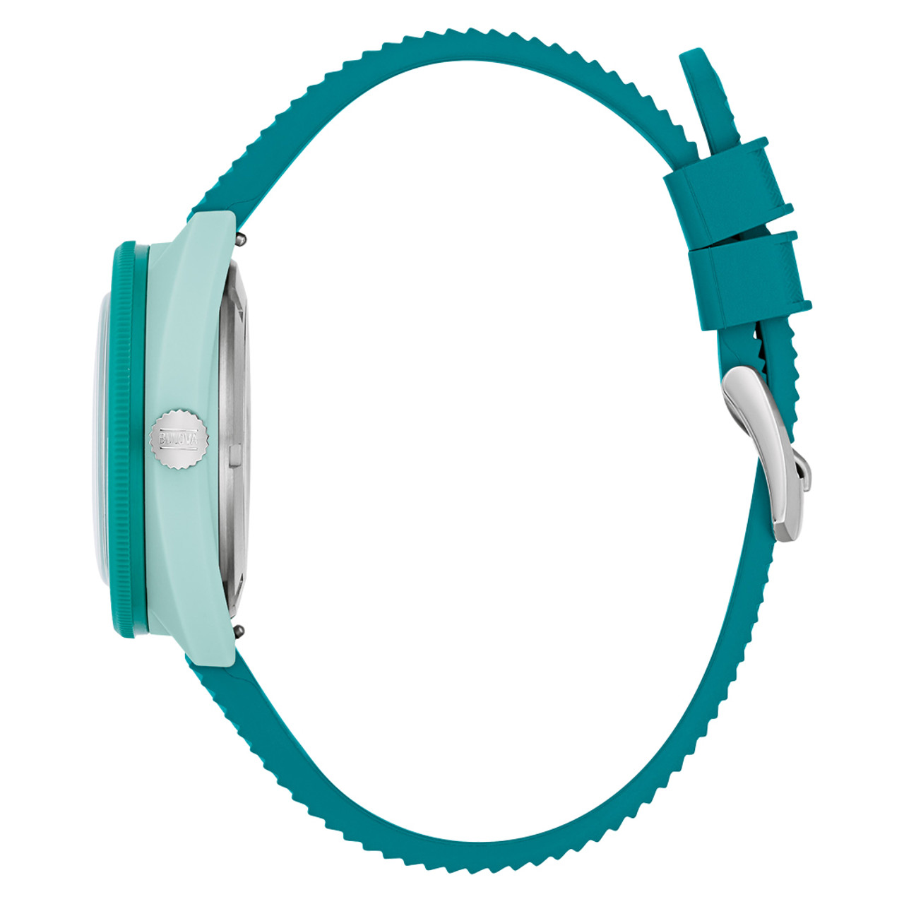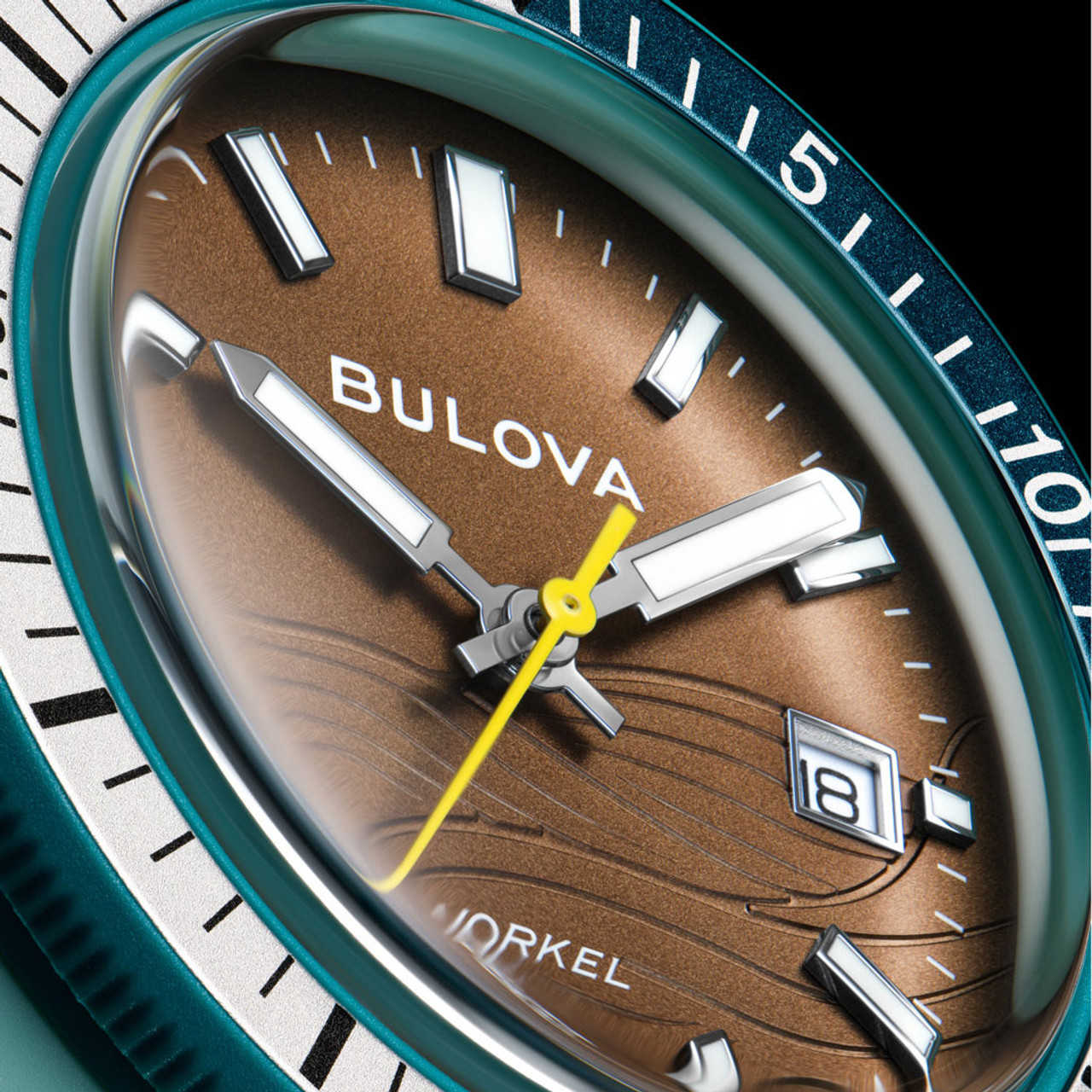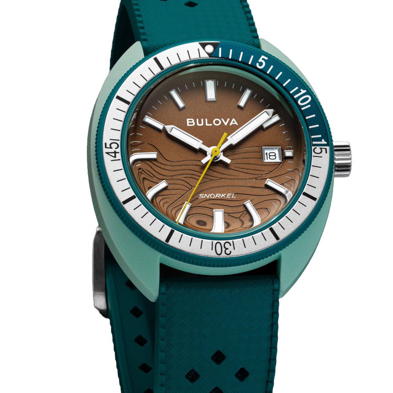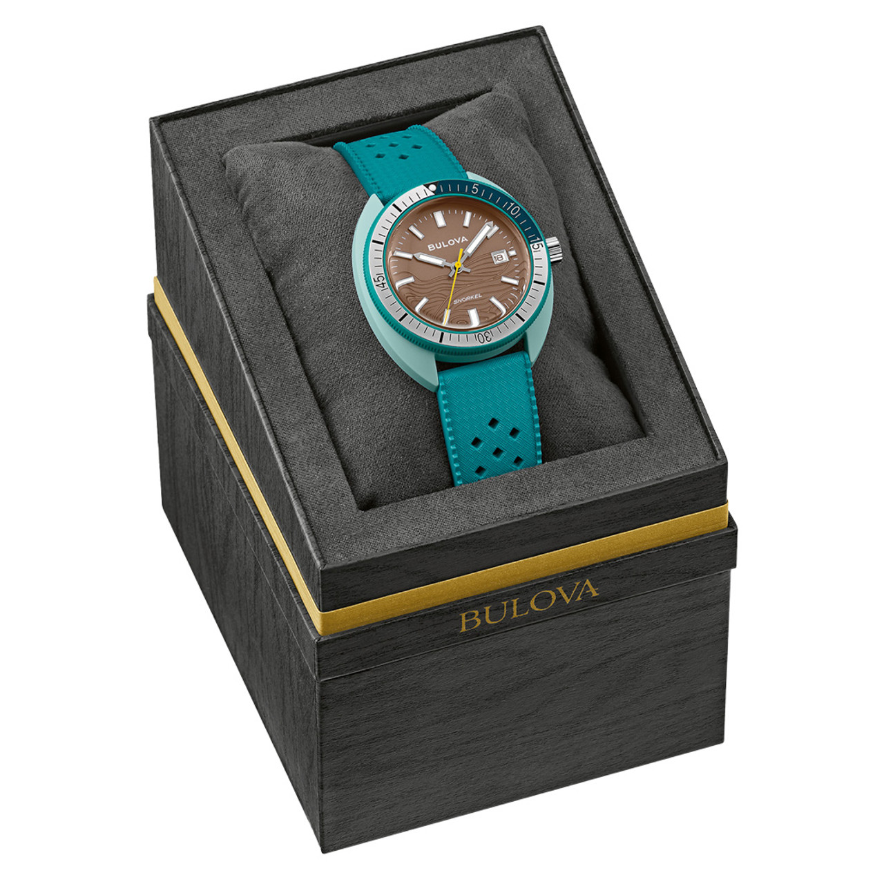 This model’s wave-pattern brown dial and striking hybrid case pair perfectly with the green unidirectional bezel with a bi-color insert and a case back etched with an image of a Sea Turtle, paying homage to its oceanic roots. With silver-tone hands and markers with luminescent fill, a date display, and a matching green perforated rubber strap, the men’s Snorkel embodies timeless design, and with 100m water resistance, it perfectly balances style and functionality with Bulova’s legacy of iconic watchmaking., it perfectly balances style and functionality with Bulova’s legacy of iconic watchmaking.