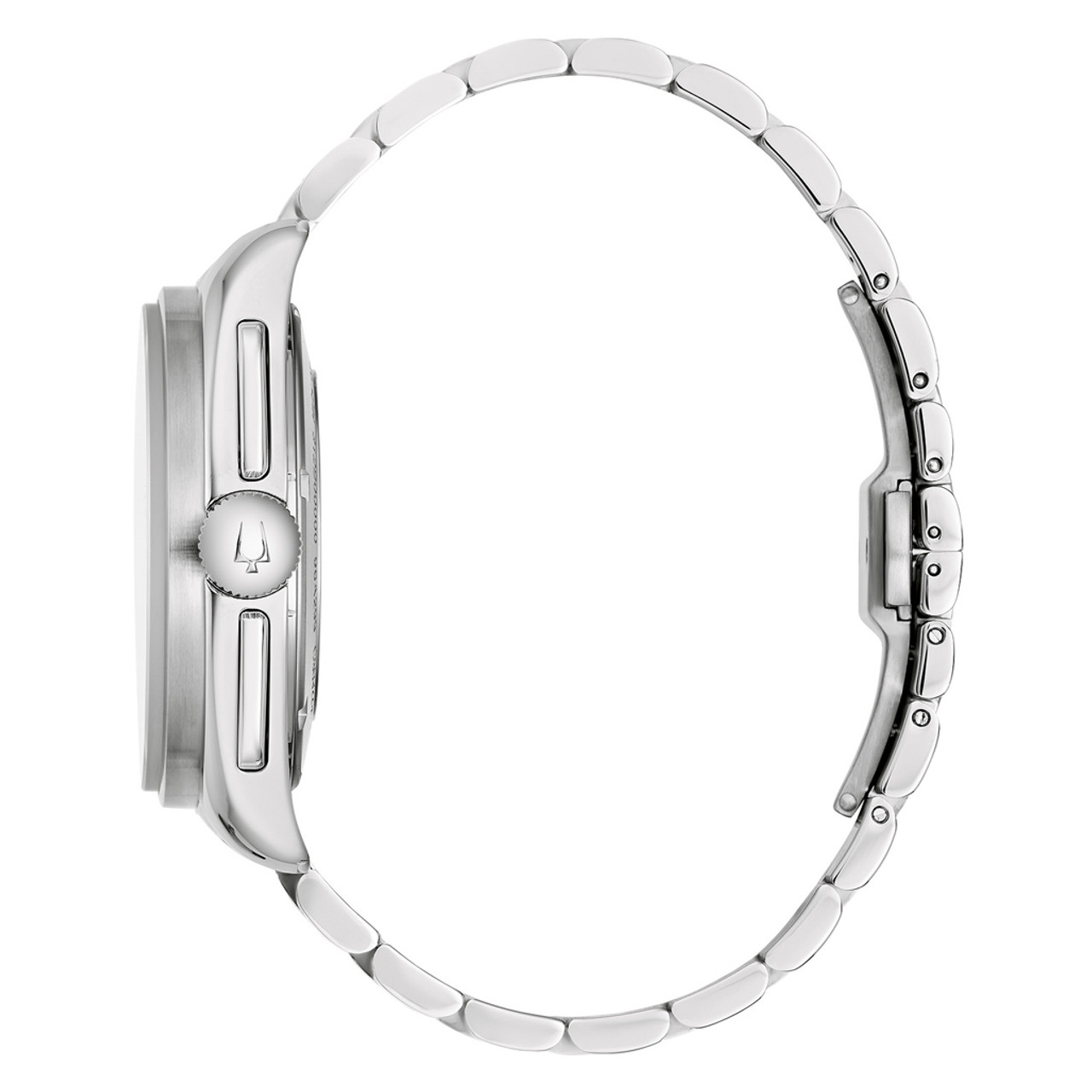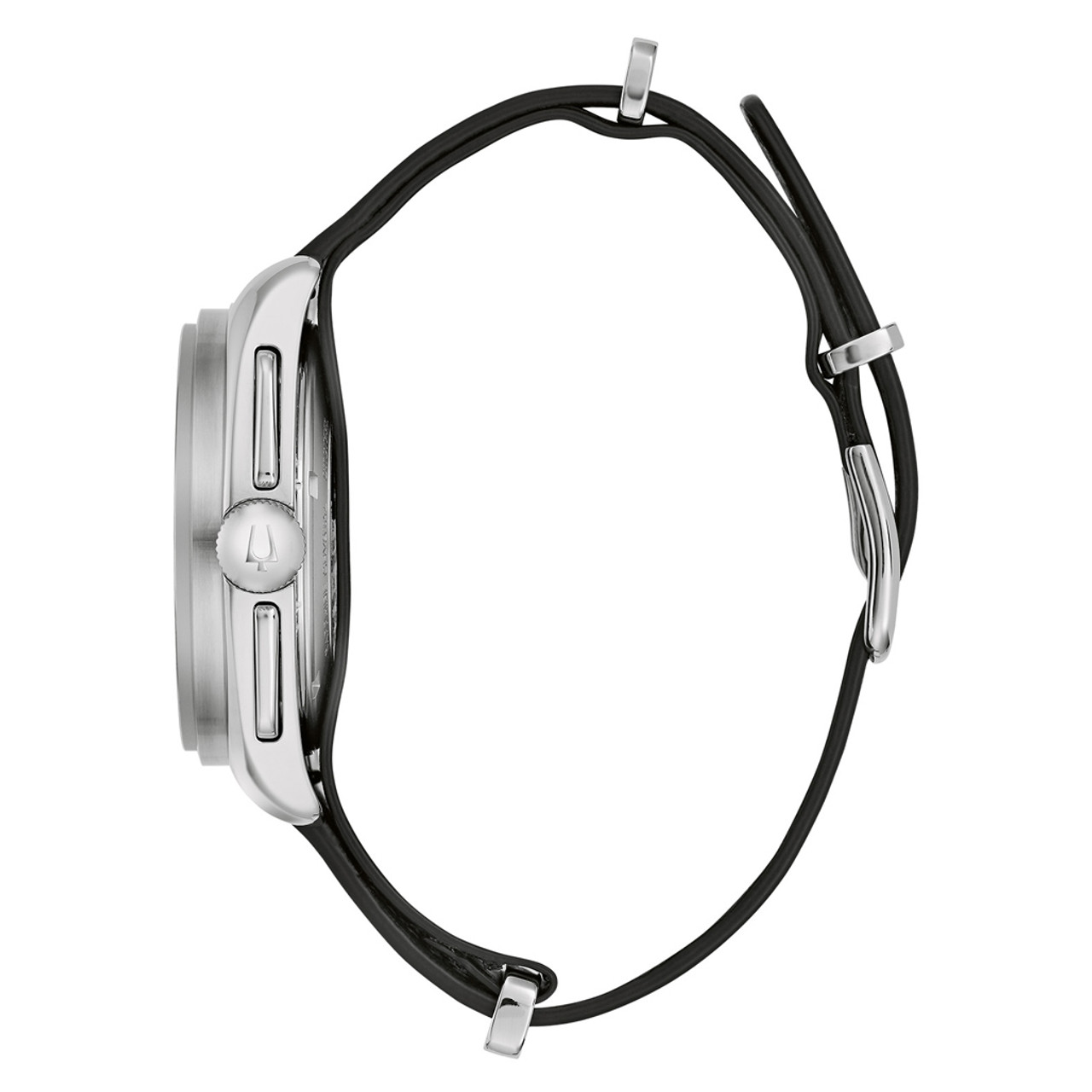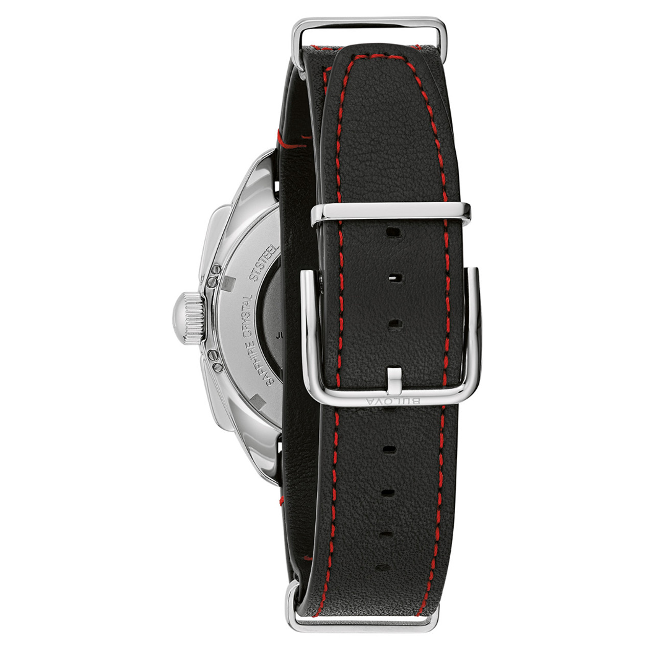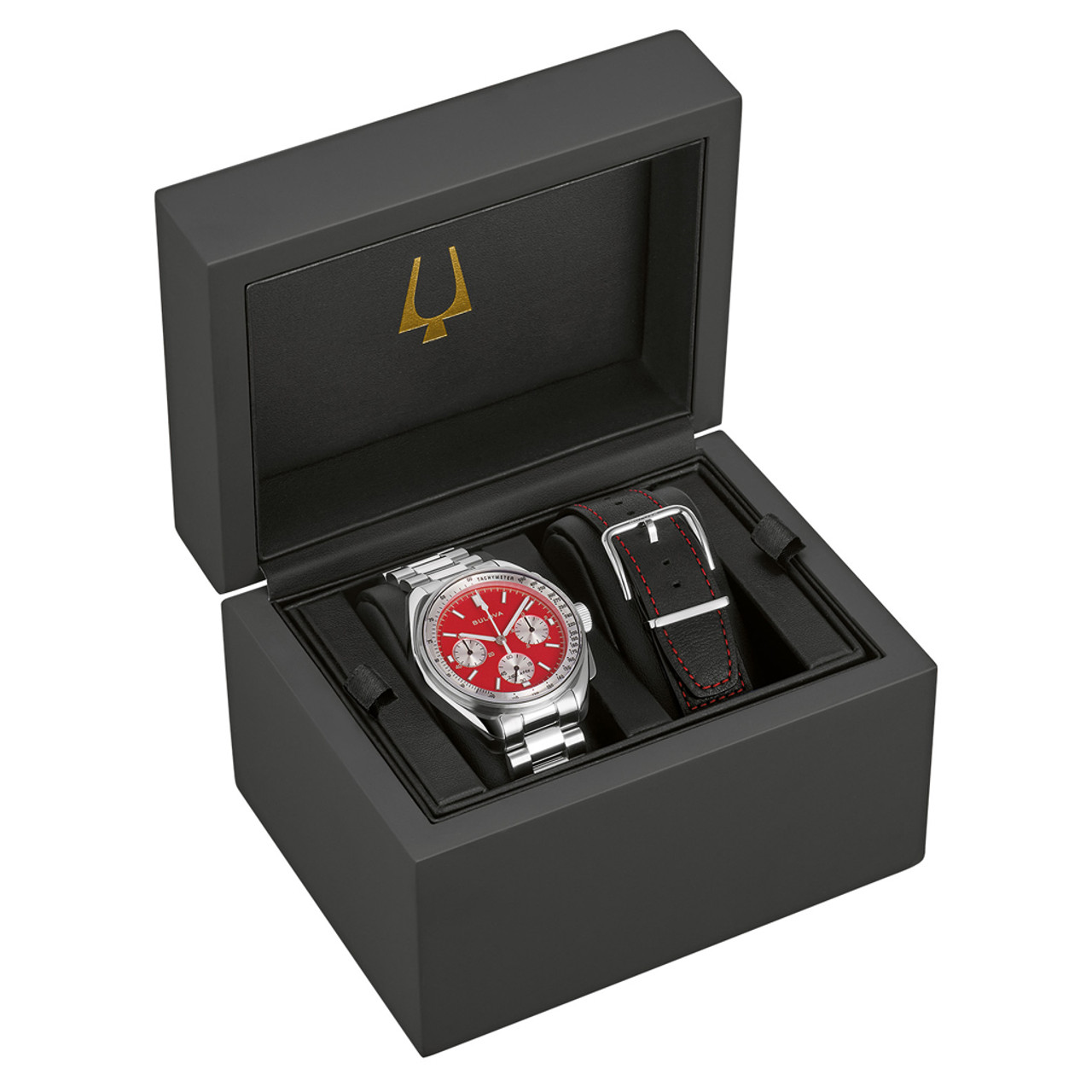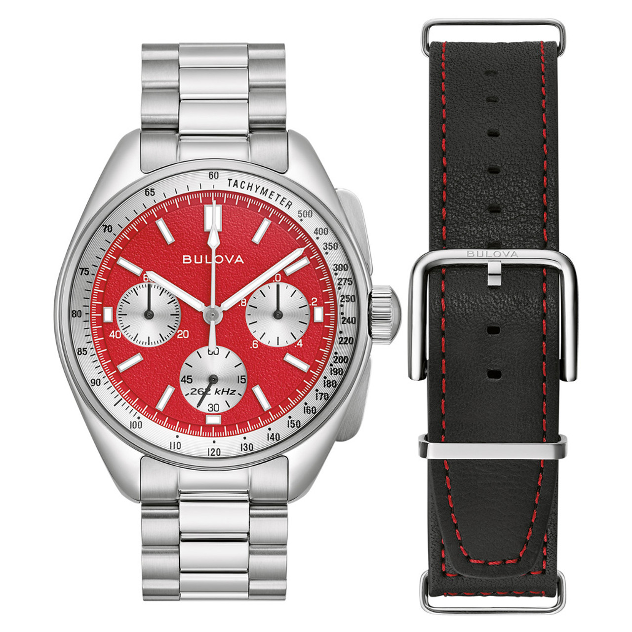 Slim chronograph pushers and a crown featuring the Bulova tuning fork logo are perfectly proportioned and ideally positioned at 3 o’clock. Under the flat sapphire crystal, the six-hand chronograph dial is presented in a unique red and silver “panda” style, with a vibrant red inspired by the tone of the moon during a total lunar eclipse, sometimes referred to as a “blood moon.” A silver-white tachymeter ring offers contrast around the dial, which features a retro Bulova logo.