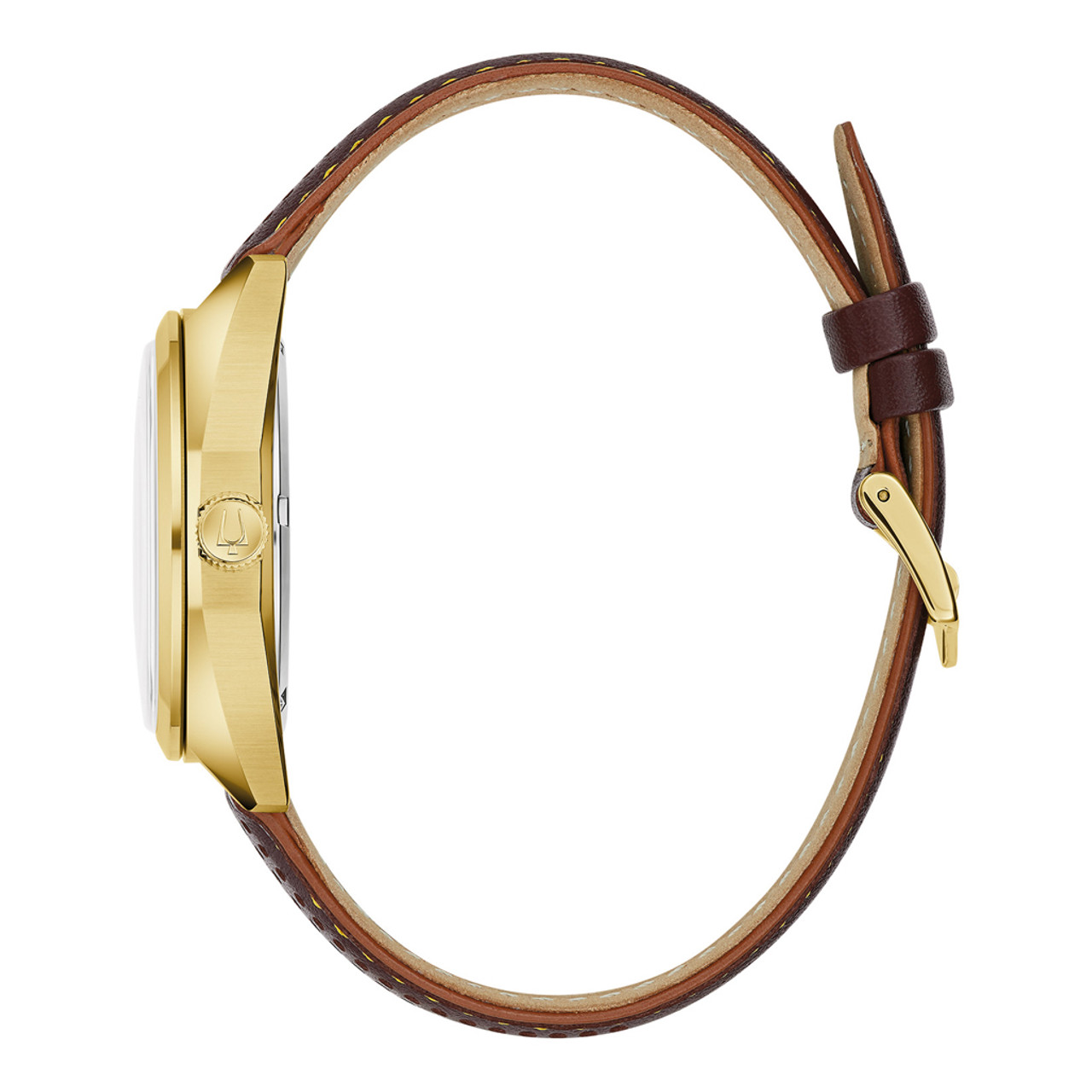 Straight from the 1970s comes the Bulova 1973 Jet Star “F”, an iconic model from the brands impressive history, now equipped with an equally impressive movement. Borrowing from its historic forebear, the gold-tone stainless steel case features a striking angular design with broad facets and a domed sapphire crystal. The warmth of the butterscotch sunburst dial is accented by a rich brown chapter ring, applied brown and gold-tone hour markers, and gold tone hands. Luminescent plots at each hour and fill in the hands allow for exceptional legibility in every environment, while a date display sits perfectly at 3 o’clock.