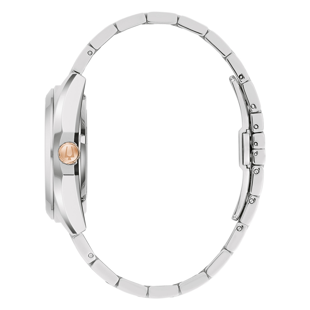 The Bulova men’s Surveyor is defined by exceptional quality and sophisticated aesthetics. The silver-tone stainless steel case features sculpted edges and faceting which provide an effortless wear on the wrist, with polished and brushed finishing, a flat sapphire crystal, and a matching quick-release 3-link stainless steel bracelet with a push-button deployant clasp. The rich burgundy dial has a sunburst finish and features rose gold-tone accents, hands with luminescent fill, debossed minute markers, and a magnified date display. The watch is powered by an 21-jewels and a 42-hour power reserve, which can be seen in full through a mineral crystal exhibition window in the caseback. For those with a discerning eye for refined luxury, this Bulova men’s timepiece is the obvious choice.