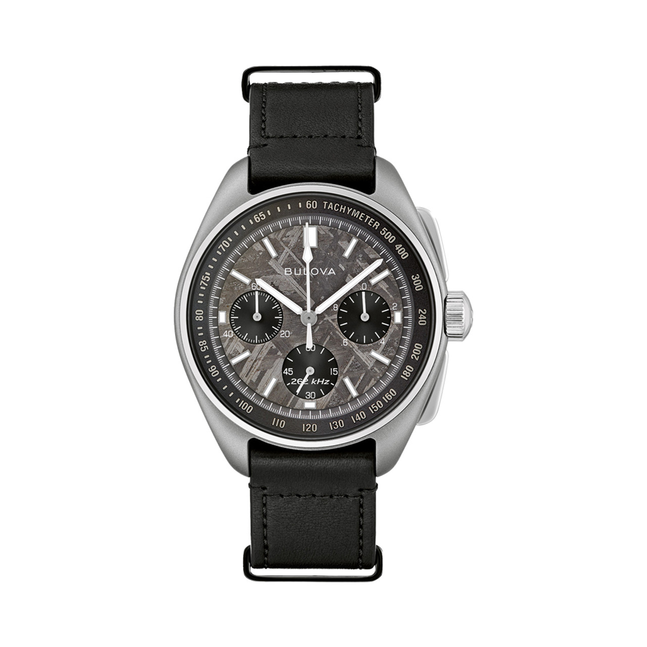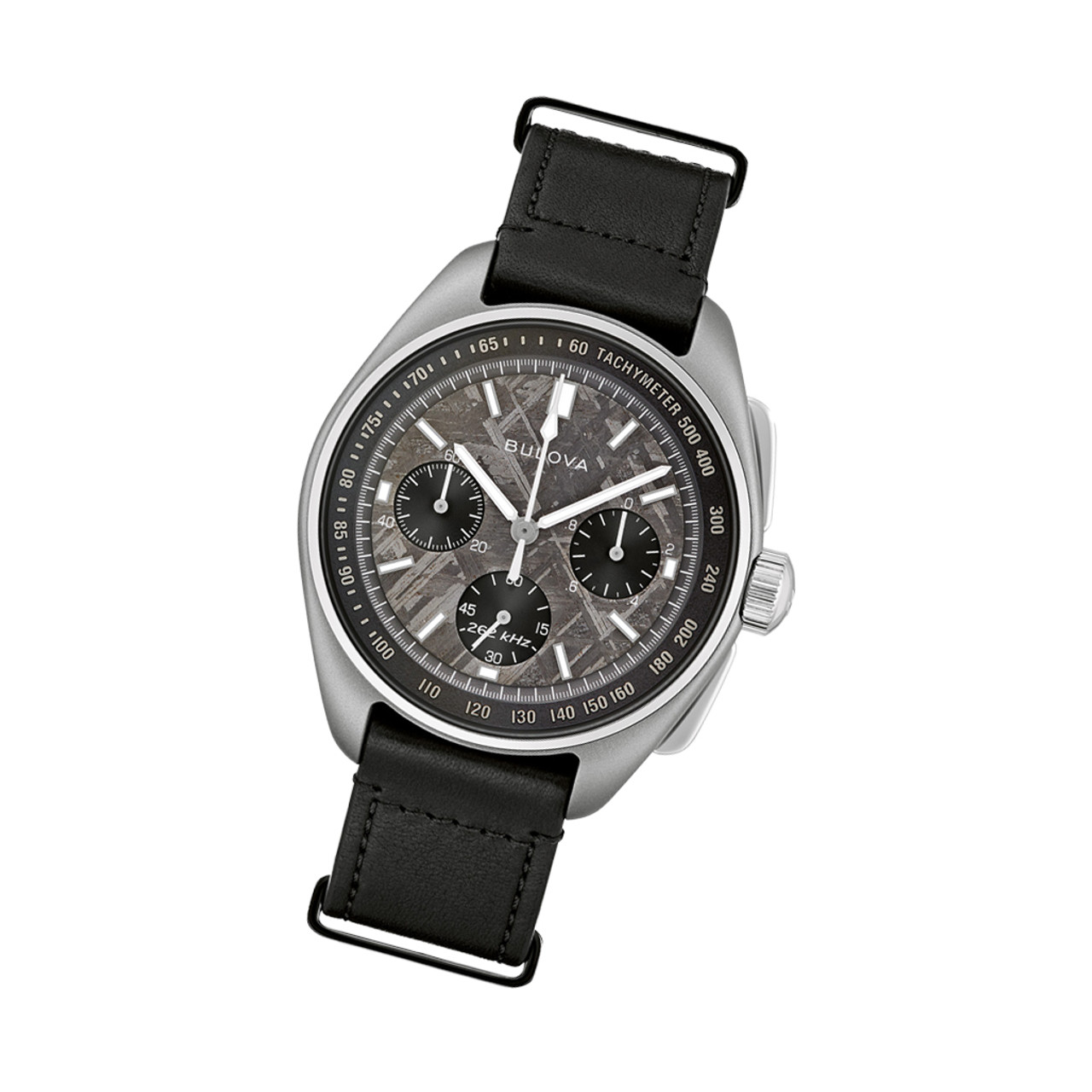 The out-of-this-world timepiece features original design elements and an eye-catching six-hand chronograph dial meticulously crafted from genuine Muonionalusta meteorite. This 4.5-billion-year-old iron meteorite was discovered in Northern Scandinavia in 1906, and its varied crystalline pattern is reflected in the exclusive design that makes every dial one-of-a-kind. Luxurious updates include a 43.5mm sandblasted silver-tone grade 5 titanium case with polished accents, creating a dynamic and incredibly lightweight presence on the wrist. Slim chronograph pushers and a crown featuring the Bulova tuning fork logo are perfectly proportioned and positioned at 3 o’clock.