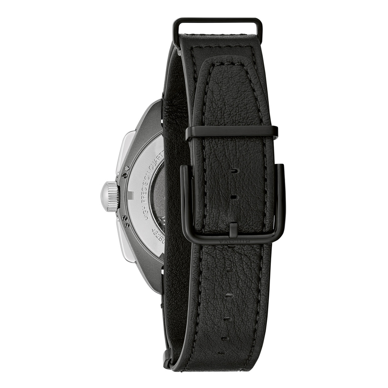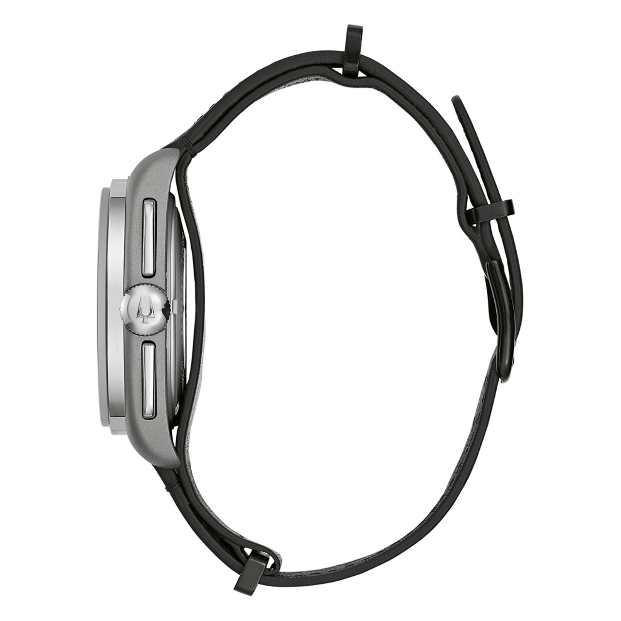 A black tachymeter ring with a retro Bulova logo displays contrast around the dial, and the luminescent hands and applied markers offer exceptional legibility. The black recessed, circular grooved sub-dials include a 1/20 chronograph seconds counter at 3 o’clock, running seconds with a sweep hand at 6 o’clock, and a 60-minute chronograph counter at 9 o’clock. Powered by our proprietary high-precision quartz technology with an accuracy of seconds per year and smooth sweep second hand, this collector’s watch is paired with a NATO black leather strap with an easy-release system for quick changes.