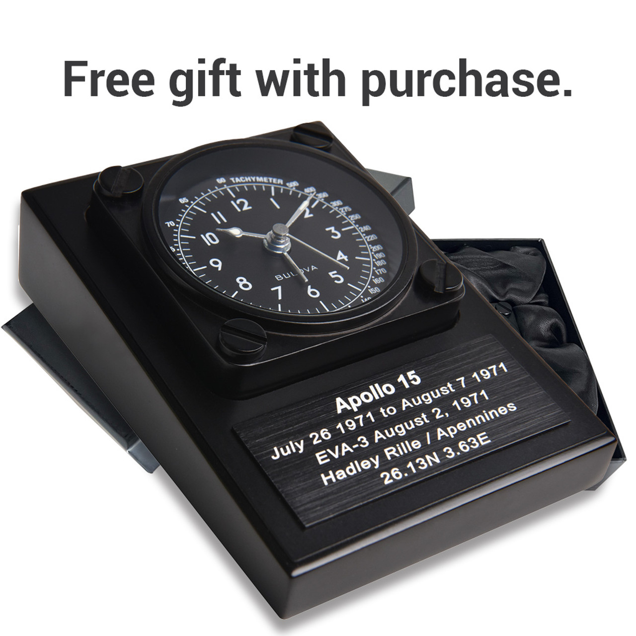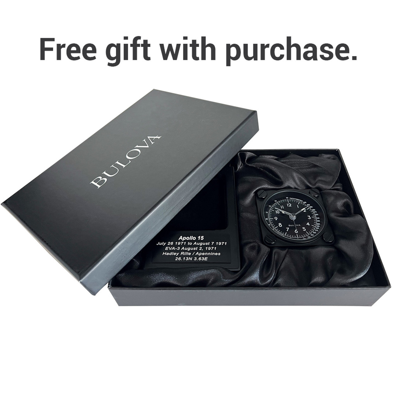 The design of our LunarPilot travel alarm clock is inspired by the Lunar capsule instrument used inthe Apollo 15 trip to the Moon. The plaque base in which the removable alarm clock rests features an engravingplate that notes the exact location the Lander was left in the Sea ofTranquility along with a Bulova-made timing instrument that was used to capturescientific data for years after the landing. Overall dimensions with clock inplaque 1.4” H x 4.1” L x 3.1” W Alarm clock (separate), 2.4” H x 2.4” W x .75”D. LR44 battery included. The clock and plaque come nestled within a sateenblack liner in a Bulova presentation box. Printed on the outer package is a map of the moon that shows the exact location of the Bulova instrument.