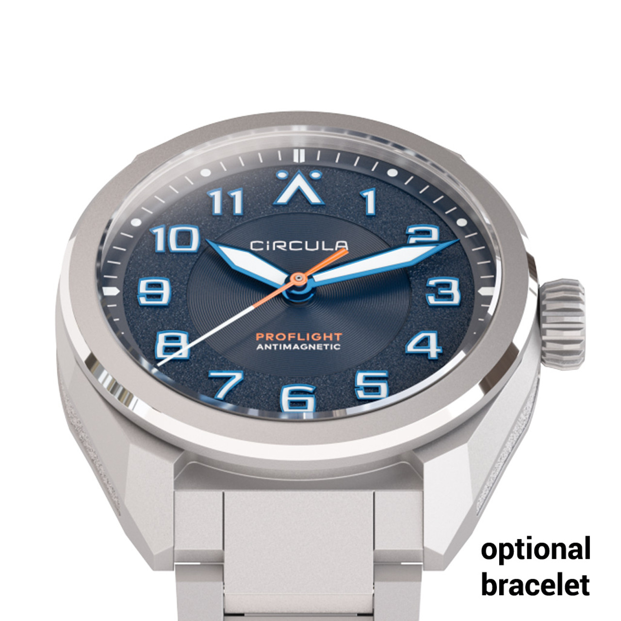 The ProFlight was designed in collaboration with Swiss star designer Guy Bove, who previously worked as Creative Director for Tag Heuer and IWC, among others. All design features have been thought through down to the smallest detail. The numerals, for example, are individually designed for perfect legibility and tie in with the design codes of the case through a subtle mix of hard edges and precise curves. The circular structure on the inside reflects the rotation of the propeller second hand. The hour hand offers a short but wide luminous surface in one shape and emphasizes the idea of the faceted case. It also has the same front angle as the pilot's triangle. The modern design of the 12 o'clock marker plays with the traditional flieger triangle in a lighter, more dynamic design. Its dots are located exactly at the 59 and 01 minute/second positions for perfect readability. The watch is the first model to receive the new Circula logo, which updates the historical design without compromising its simplicity.