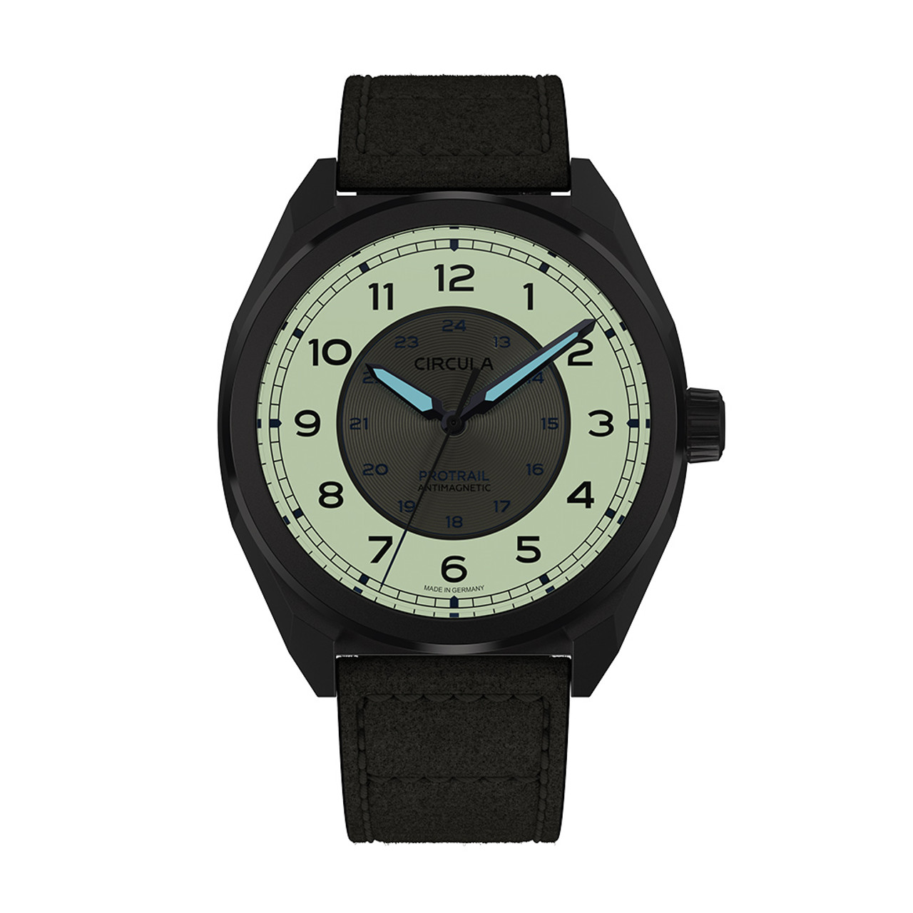 Our Circula ProTrail is also antimagnetic up to 80,000 A/m due to its soft iron cage. This makes the watch insensitive to magnetic fields from smartphones, laptops and other electrical devices, which can negatively affect the accuracy. Thanks to the Super-LumiNova in the hands and numbers/indexes of our Circula Field-Watch, the time can be read reliably even in the dark.