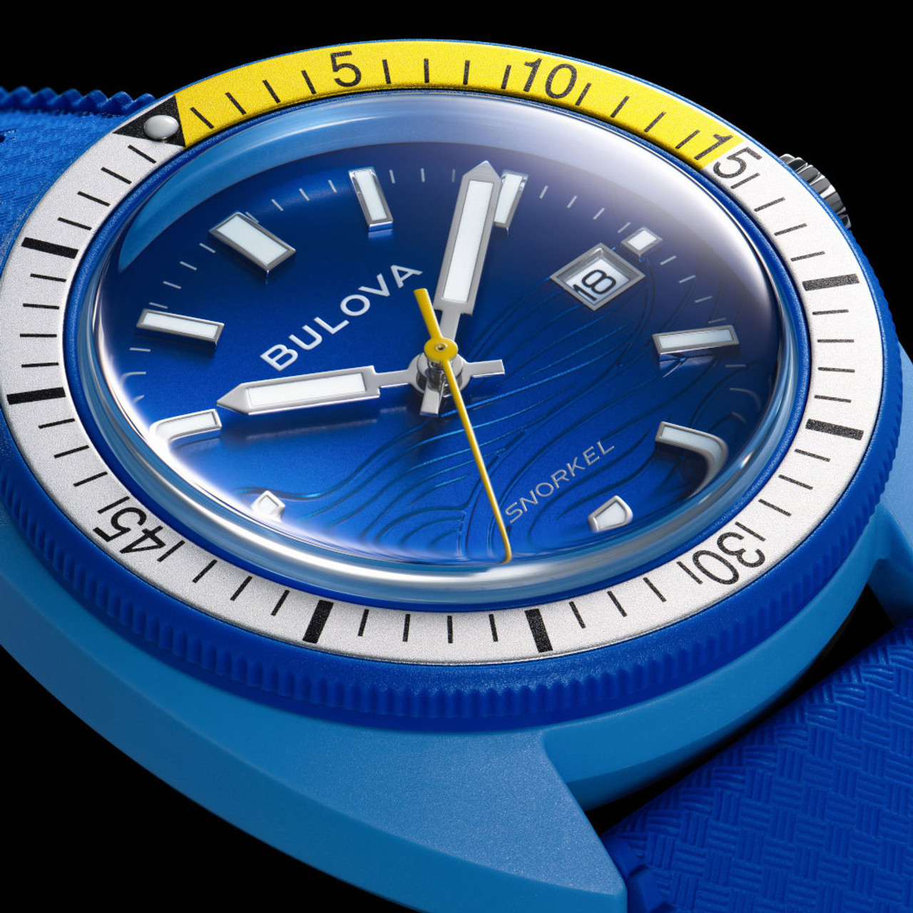 Continuing Bulova’s tradition of innovation and fine craftsmanship, our new Snorkel collection blends vintage-inspired design with a fresh, modern twist. The reimagined Bulova Snorkel shares DNA with the iconic Oceanographer through its classic yet recognizable case shape. In vibrant hues inspired by marine life, each 41mm timepiece features a retro case shape made with a new innovative Hybrid Ceramic—a composite material that feels luxuriously smooth with enhanced durability.